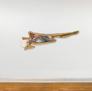“Woof” (2025), wood, oil on cotton fabric. Courtesy of artist.