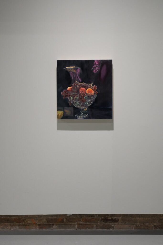 Some tension is more formal in origin. The floral still life of a few lilies (above our heads) (2023)—alluding to Black gay literary icons Bruce Nugent (Smoke, Lilies and Jade [1926]) and James Baldwin (Just Above My Head [1979])—is a bit unsettling. The vases are cans, beer bottles, and a bleach bottle containing a suspiciously yellow liquid. The titular lilies (one calla, one Easter) poke awkwardly toward the top right corner; the overall effect is restless and unquiet. Its dark twin, table grapes (2023), is equally off-kilter. The composition pushes tightly to the left, the colors lurid in the dark space. Objects that seem unconnected to consensual daily reality float in the top half of the image.