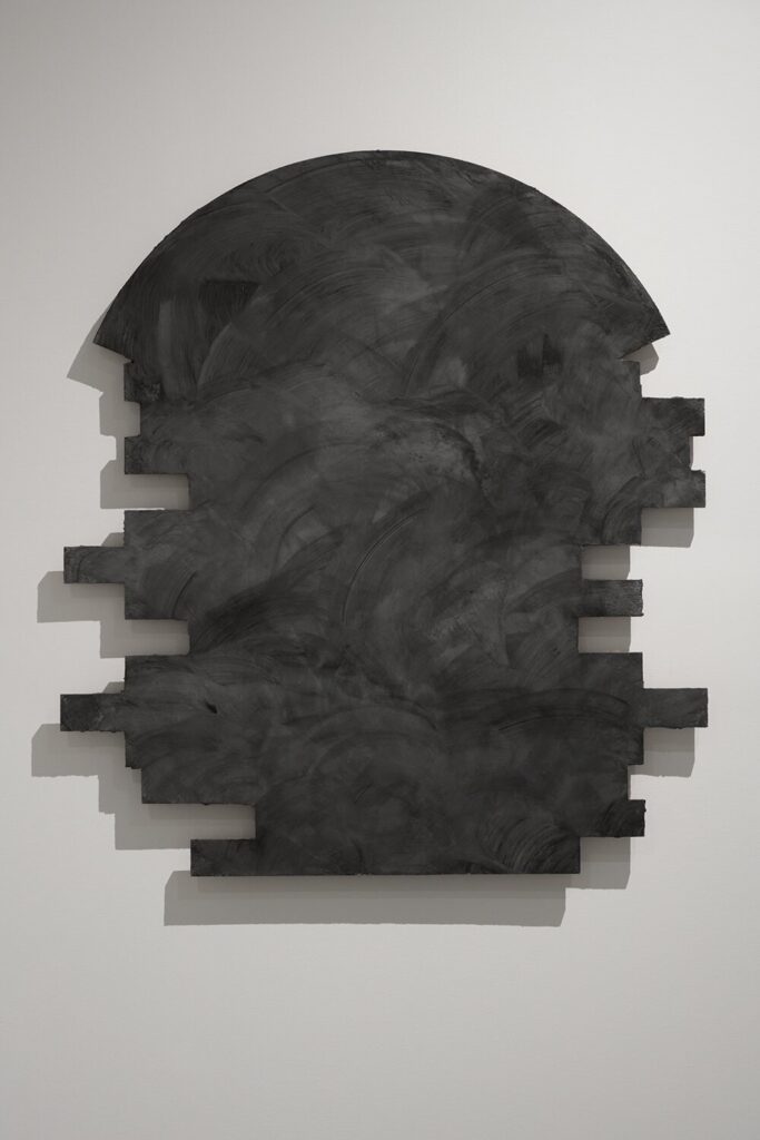 Light moves through the work in beautiful ways, literal and figurative. In the wall sculpture hole in the wall (seasonal maintenance) [peach pit black / summer] (2023), rectangular side projections create shadows that play the room light like an instrument. Gestural brushstrokes create a lovely glow in the top center of the 45-inch-tall piece.