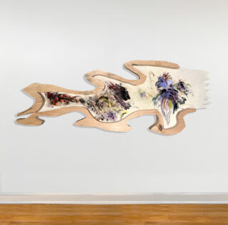 “Woof” (2025), wood, oil on cotton fabric. Courtesy of artist.
