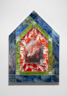 "To Care Is To Plant A Seed" (2023), Stained glass, powder / enamel screen print on glass. Photo by Vivian Marie Doering.